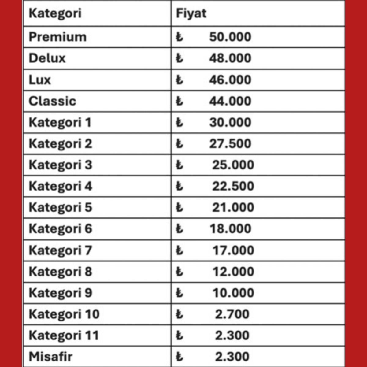 Premium biletleri sırasıyla Delux (48 bin TL), Lux (46 bin TL) ve Classic (44 bin TL) kategorileri takip ediyor.