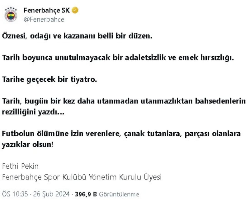 Sarı lacivertli kulübün yönetim kurulu üyesi Fethi Pekin, kulübün sosyal medya hesabından yaptığı açıklamalarda şu ifadelere yer verdi: