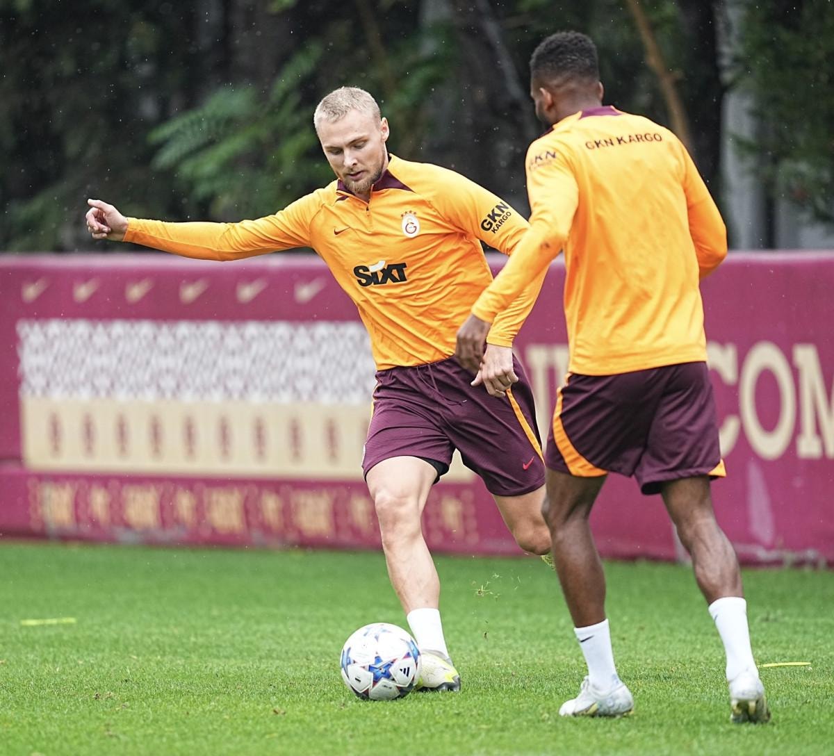 Florya Metin Oktay Tesisleri’nde teknik direktör Okan Buruk yönetiminde yapılan antrenman; dinamik ısınmayla başlayıp, 8’e 2 pas çalışmasıyla devam etti.