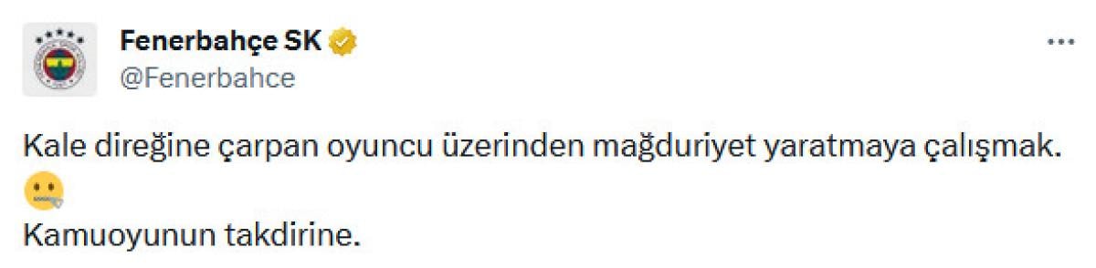Kulüpten yapılan açıklamada, "Kale direğine çarpan oyuncu üzerinden mağduriyet yaratmaya çalışmak. Kamuoyunun takdirine." ifadeleri kullanıldı.