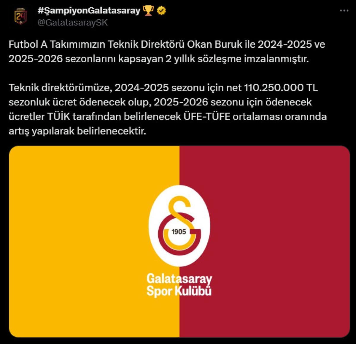 Futbol A Takımımızın Teknik Direktörü Okan Buruk ile 2024-2025 ve 2025-2026 sezonlarını kapsayan 2 yıllık sözleşme imzalanmıştır.
