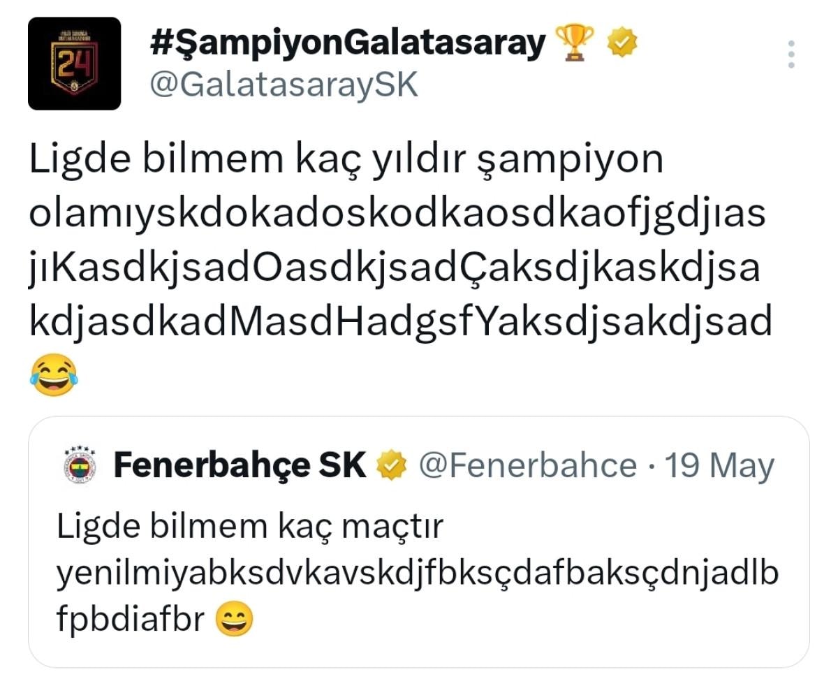 Fenerbahçe'nin Galatasaray'ı yendikten sonra attığı "Bilmem kaç maçtır evinde yenilmiyor." tweet'ini alıntılayan sarı-kırmızılı takım, "Bilmem kaç maçıt şampiyon olamıyor." yazısının ardından random gülme attı.