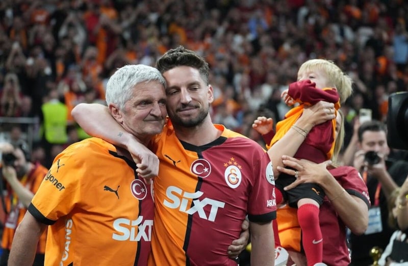 Galatasaray ile son maçına çıkan Dries Mertens de büyük coşkuyla platformdaki yerini aldı. Mertens’in oğlu Ciro’yu kazanılan kupanın içine koyması dikkat çekti.