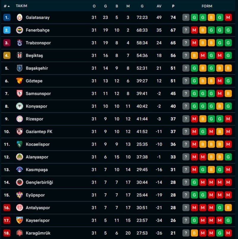Süper Lig'in 32. haftasında 2 Mayıs Cumartesi günü Samsunspor'a konuk olacak Galatasaray, deplasmandan 3 puanla dönmesi durumunda bitime 2 maç kala rakiplerinin sonuçlarına bakmaksızın şampiyonluğunu ilan edecek.
