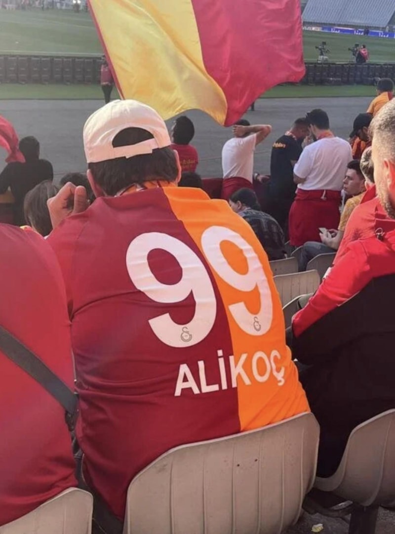 Galatasaray'a ayrılan deplasman tribünde bulunan bir sarı-kırmızılı futbolseverin formasının arkasına Fenerbahçe Başkanı Ali Koç'un ismini yazdırdığı görüldü.