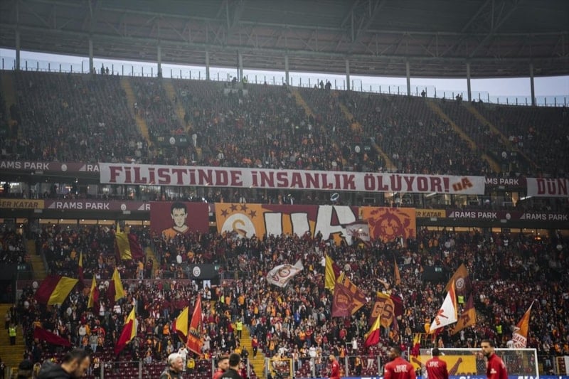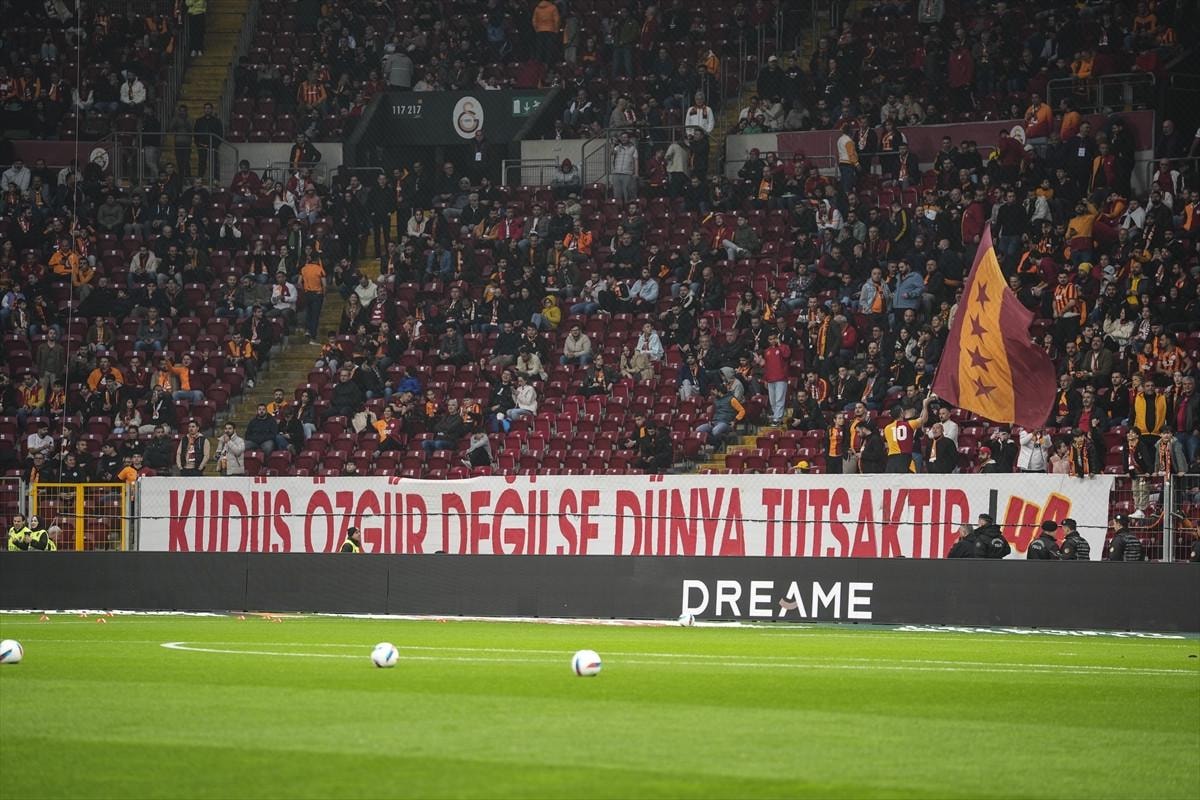 Galatasaray taraftarı ayrıca Filistin'e yaşanan olaylara dikkat çekmek için tribünlere, 'Filistin'de insanlık ölüyor', 'Dünya soykırımı canlı canlı izliyor', 'Kudüs özgür değişse dünya tutsaktır' ve 'Filistin'e özgürlük' pankartları astı.