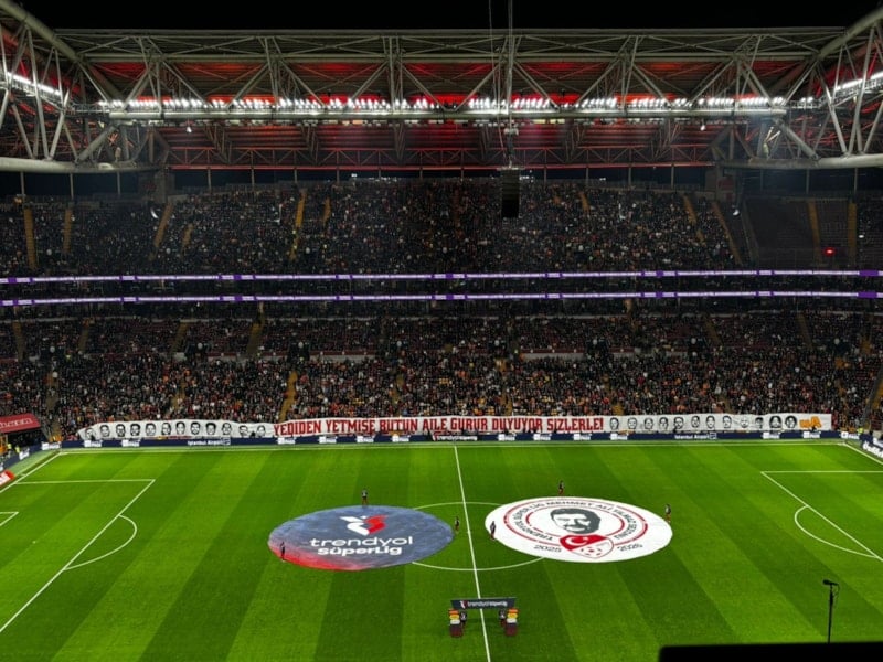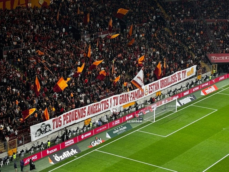 Galatasaraylı taraftarlar ayrıca Doğu Tribününde Teknik Direktör Okan Buruk ve futbolcuların görsellerinin yer aldığı bir pankart daha açtı ve "Yediden yetmişe bütün aile gurur duyuyor sizlerle!" yazısını ekledi.