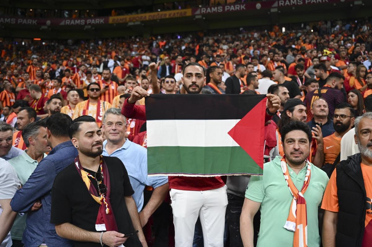 Bazı Galatasaraylı taraftarlar, İsrail'in Gazze'de yaşattığı katliamlara karşı Filistin'e destek için tribünlerde Filistin bayrağı açtı.