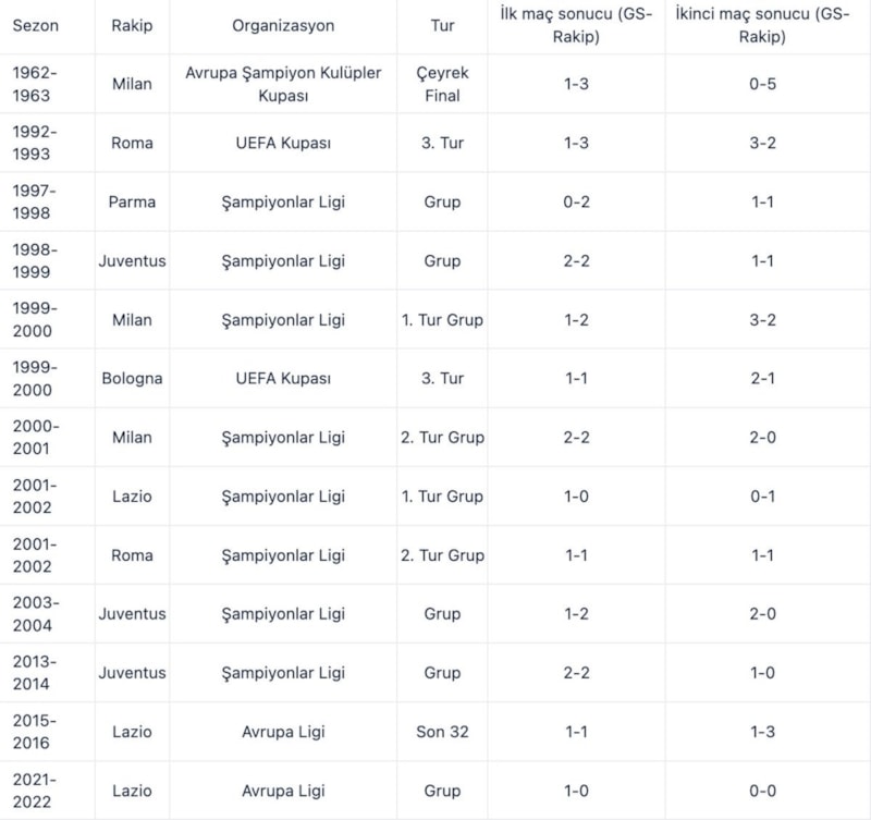 Galatasaray'ın Avrupa kupalarında İtalyan ekiplerine karşı oynadığı maçlar ve aldığı sonuçlar ise şöyle...