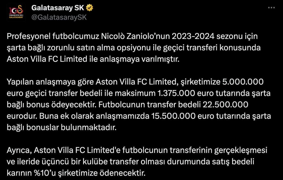 Profesyonel futbolcumuz Nicolo Zaniolo'nun 2023-2024 sezonu için şarta bağlı zorunlu satın alma opsiyonu ile geçici transferi konusunda Aston Villa FC Limited ile anlaşmaya varılmıştır.