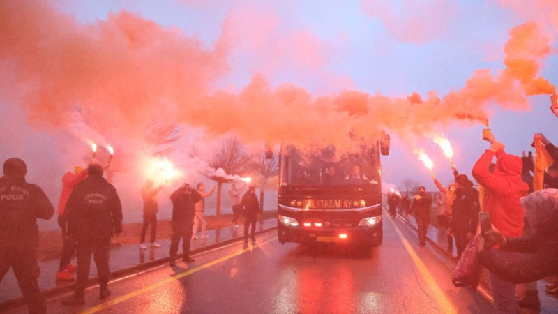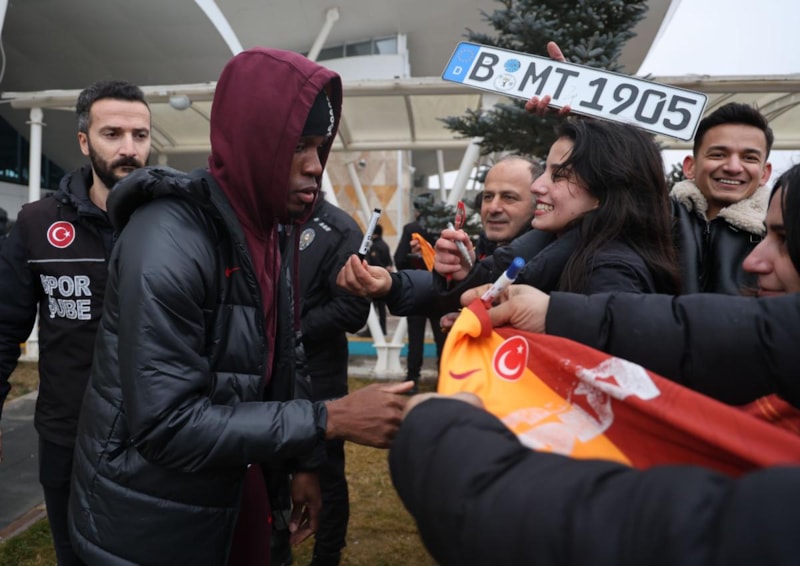 Uçakla Sivas Nuri Demirağ Havalimanı’na gelen sarı-kırmızılı kafileyi, bir grup Galatasaray taraftarı çiçekler ve meşalelerle karşıladı.