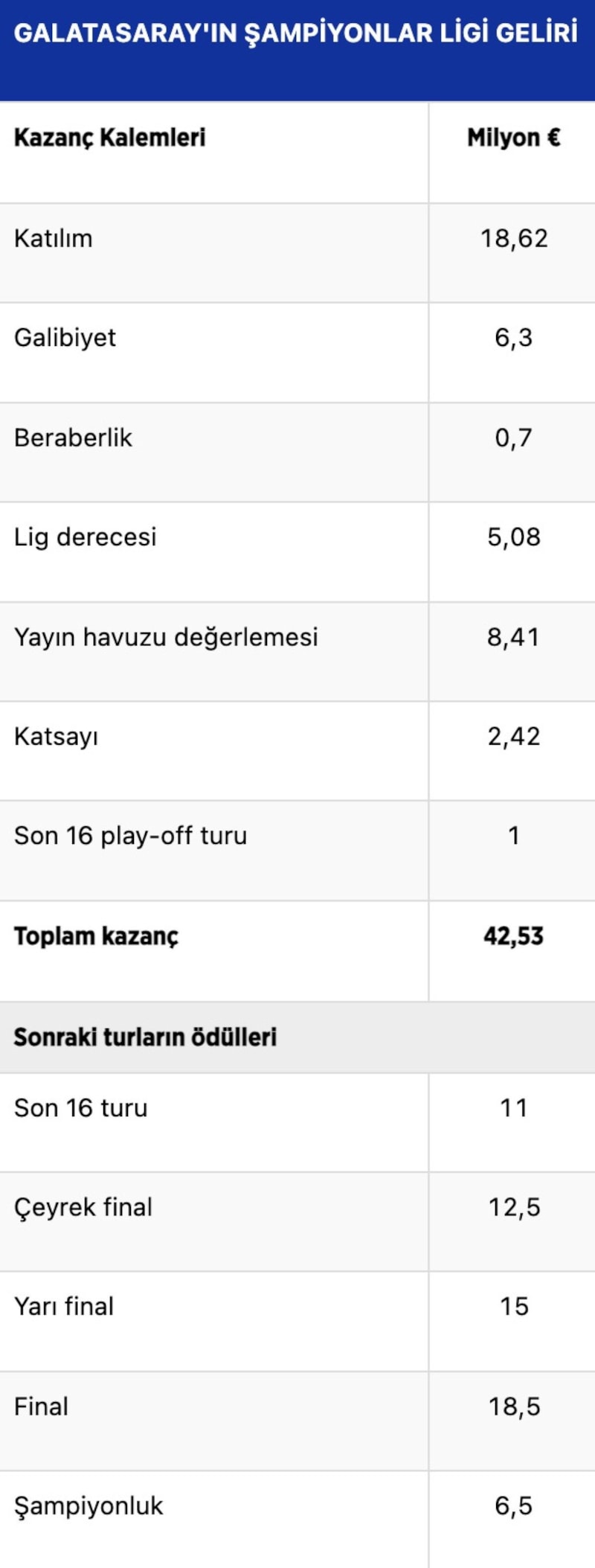 An itibarıyla UEFA’dan toplamda 42,5 milyon euro kazanan Galatasaray, son 16 play-off turunu geçmesi halinde 11 milyon euro daha kazanacak.