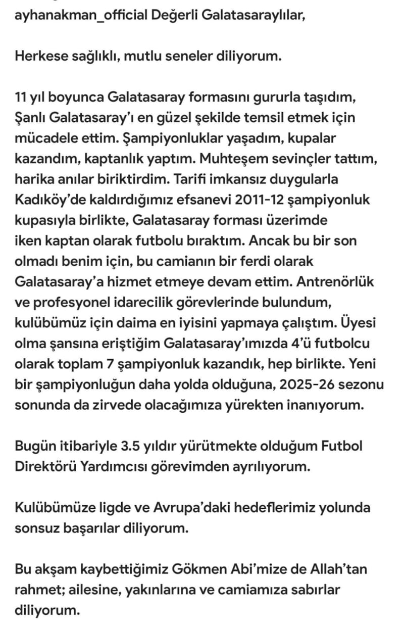Bugün itibarıyla 3,5 yıldır yürütmekte olduğum futbol direktörü yardımcısı görevinden ayrılıyorum. Kulübümüze ligde ve Avrupa’daki hedeflerimiz yolunda sonsuz başarılar diliyorum. Bu akşam kaybettiğimiz Gökmen Abimize de Allah’tan rahmet, ailesine, yakınlarına ve camiamıza sabırlar diliyorum.