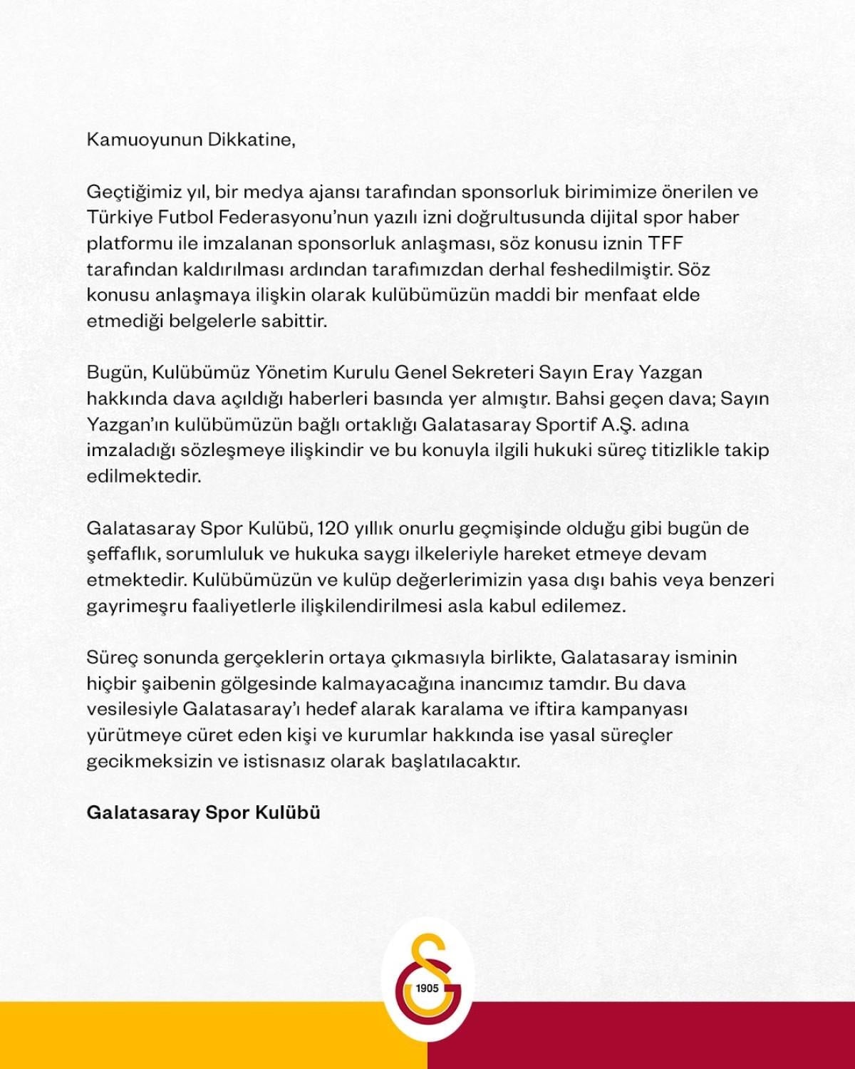 Galatasaray Kulübü, resmi hesabından kamuoyuna bir bilgilendirme mesajı paylaştı.