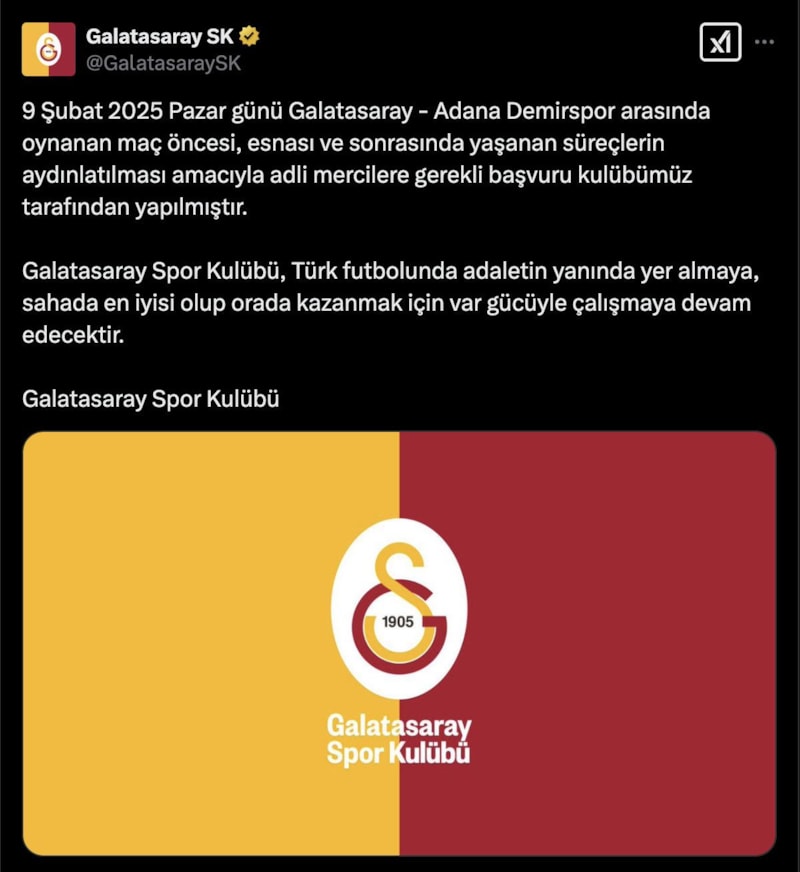 9 Şubat 2025 Pazar günü Galatasaray - Adana Demirspor arasında oynanan maç öncesi, esnası ve sonrasında yaşanan süreçlerin aydınlatılması amacıyla adli mercilere gerekli başvuru kulübümüz tarafından yapılmıştır.