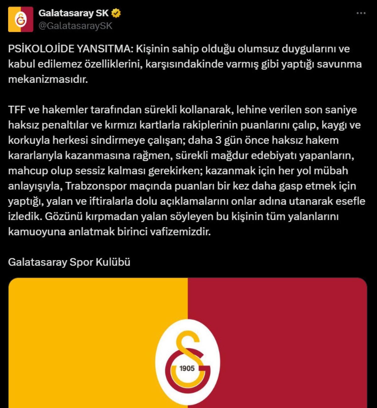 TFF ve hakemler tarafından sürekli kollanarak, lehine verilen son saniye haksız penaltılar ve kırmızı kartlarla rakiplerinin puanlarını çalıp, kaygı ve korkuyla herkesi sindirmeye çalışan; daha 3 gün önce haksız hakem kararlarıyla kazanmasına rağmen, sürekli mağdur edebiyatı yapanların, mahcup olup sessiz kalması gerekirken; kazanmak için her yol mübah anlayışıyla, Trabzonspor maçında puanları bir kez daha gasp etmek için yaptığı, yalan ve iftiralarla dolu açıklamalarını onlar adına utanarak esefle izledik. Gözünü kırpmadan yalan söyleyen bu kişinin tüm yalanlarını kamuoyuna anlatmak birinci vafizemizdir.
