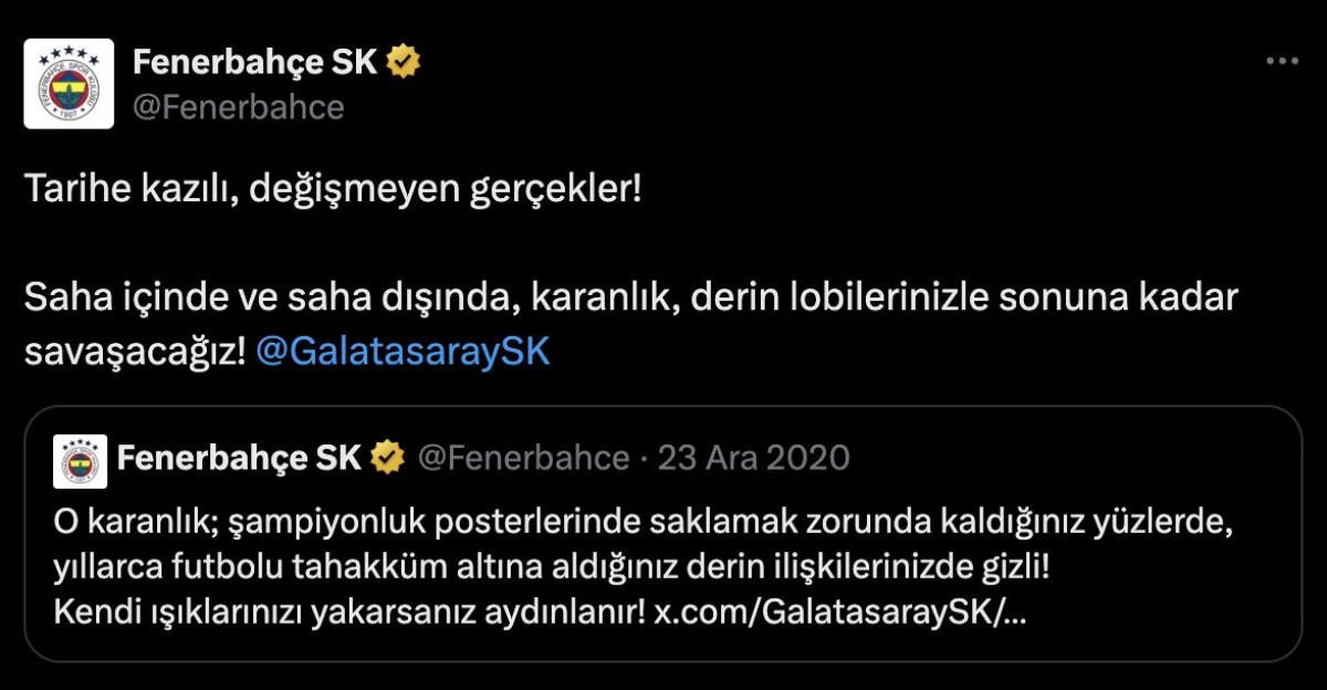 Yapılan paylaşımda, "Tarihe kazılı, değişmeyen gerçekler! Saha içinde ve saha dışında, karanlık, derin lobilerinizle sonuna kadar savaşacağız!" ifadeleri kullanıldı.