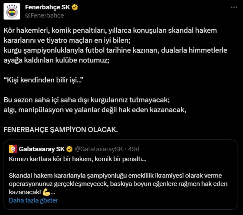 Galatasaray, Fenerbahçe - Alanyaspor maçının ardından hakem yönetimi hakkında bir paylaşımda bulundu. Sarı-lacivertliler ise kısa süre içerisinde ezeli rakibinin bu paylaşımına yanıt verdi.