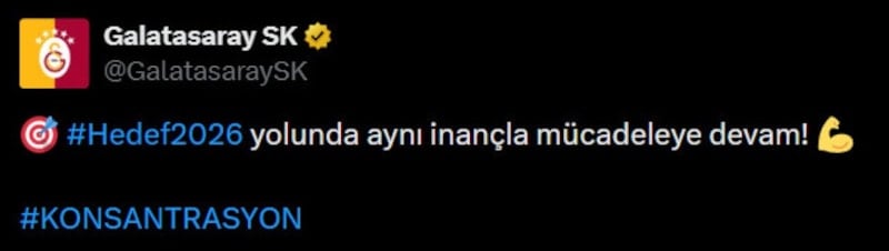 Alanyaspor maçından bir video paylaşan sarı-kırmızılılar, bu paylaşımına, "Hedef 2026 yolunda aynı inançla mücadeleye devam!" ve "Konsantrasyon" ifadelerini yazdı.