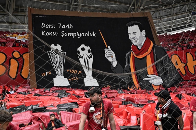 Koreografide ilk olarak tahtanın önünde yer alan Galatasaray Teknik Direktörü Okan Buruk ve 'Ders: Tarih, Konu: Şampiyonluk' yazıları yer aldı.
