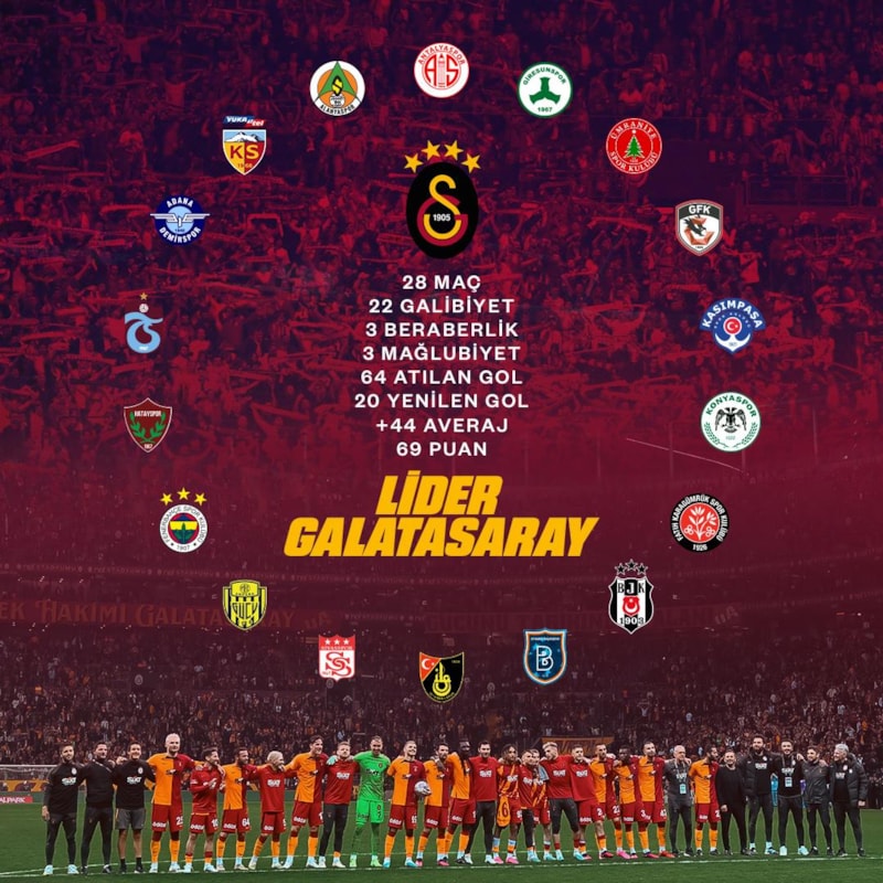 Sarı-kırmızılıların paylaşımında, "30. hafta itibarıyla Süper Lig'de 18 rakibi de sahada yenen tartışmasız lider Galatasaray." ifadeleri kullanıldı.