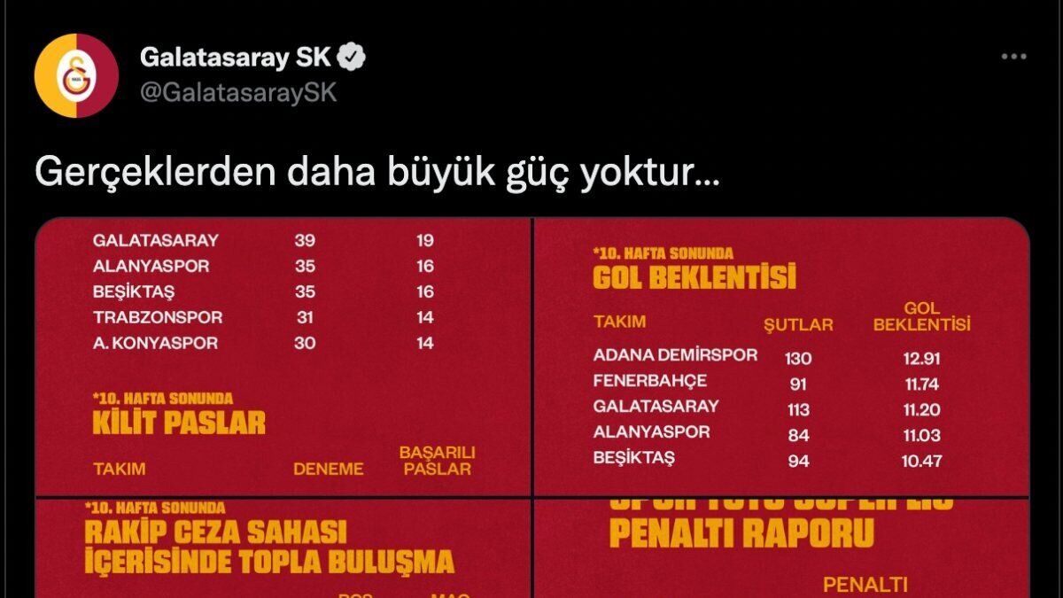 Sarı-kırmızılılardan yapılan açıklamada, ligin geride kalan 10 haftasındaki ceza alanı içerisine atılan paslar, kilit paslar, gol beklentisi ve rakip ceza sahası içerisinde topla buluşma ve penaltı raporunun görselleri paylaşılarak, "Gerçeklerden daha büyük güç yoktur…" ifadeleri kullanıldı.