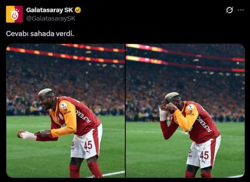 Galatasaray Kulübü, resmi hesabından Victor Osimhen'i paylaşarak "Cevabı sahada verdi" notunu düşerek Fenerbahçe'ye göndermede bulundu.