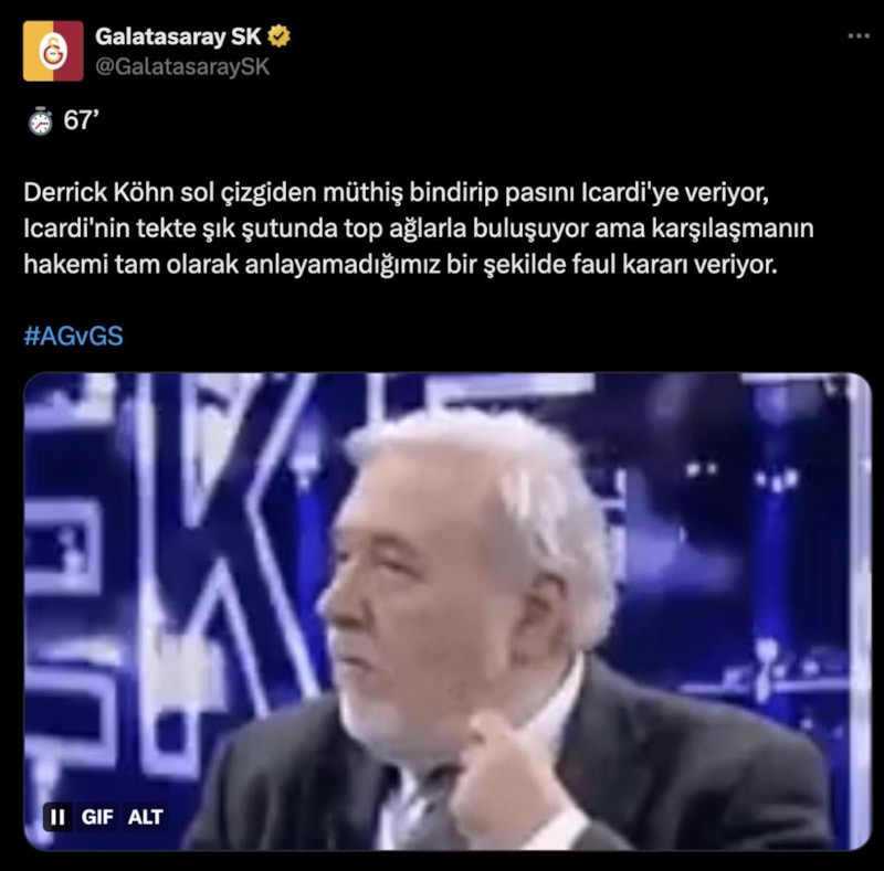 Galatasaray, Ankaragücü'ne konuk olduğu maçta Mauro Icardi ile bulduğu golün ofsayt olması nedeniyle hakeme tepki gösterdi. Sarı-kırmızılılar bu paylaşımında İlber Ortaylı'nın videosunu kullandı.