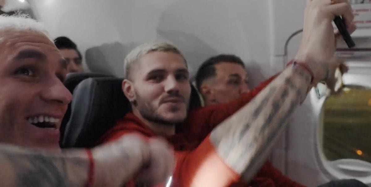 Galatasaray'ın resmi Twitter hesabı yaptığı paylaşımla uçakta olan anları taraftarlar ile paylaştı. Görüntülerde; Mauro Icardi ile özdeşleşen, şarkıcı Simge'nin seslendirdiği 'Aşkın olayım' parçası çaldı ve Icardi'ye Lucas Torreira ile Fernando Muslera da eşlik etti.