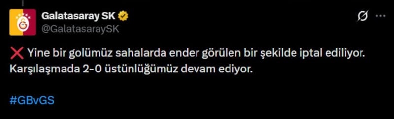 Galatasaray Kulübü, Gençlerbirliği maçında Leroy Sane'nin iptal edilen golü sonrasında sosyal medya hesabından tepki gösterdi.