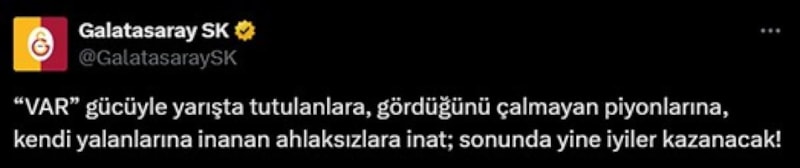 Hakem kararlarının öne çıktığı karşılaşmada ev sahibi Konyaspor'un ardından sarı-lacivertlilerin ezeli rakibi Galatasaray da bir paylaşım yaparak VAR'a tepki gösterdi.