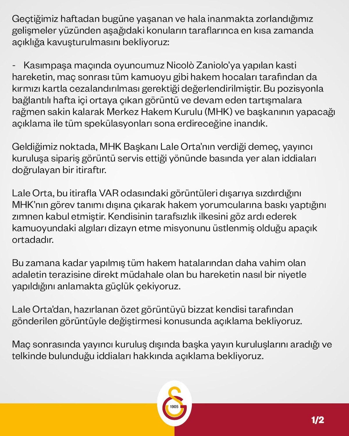 Galatasaray, Merkez Hakem Kurulu Başkanı Lale Orta'nın açıklamalarına cevap verdi.