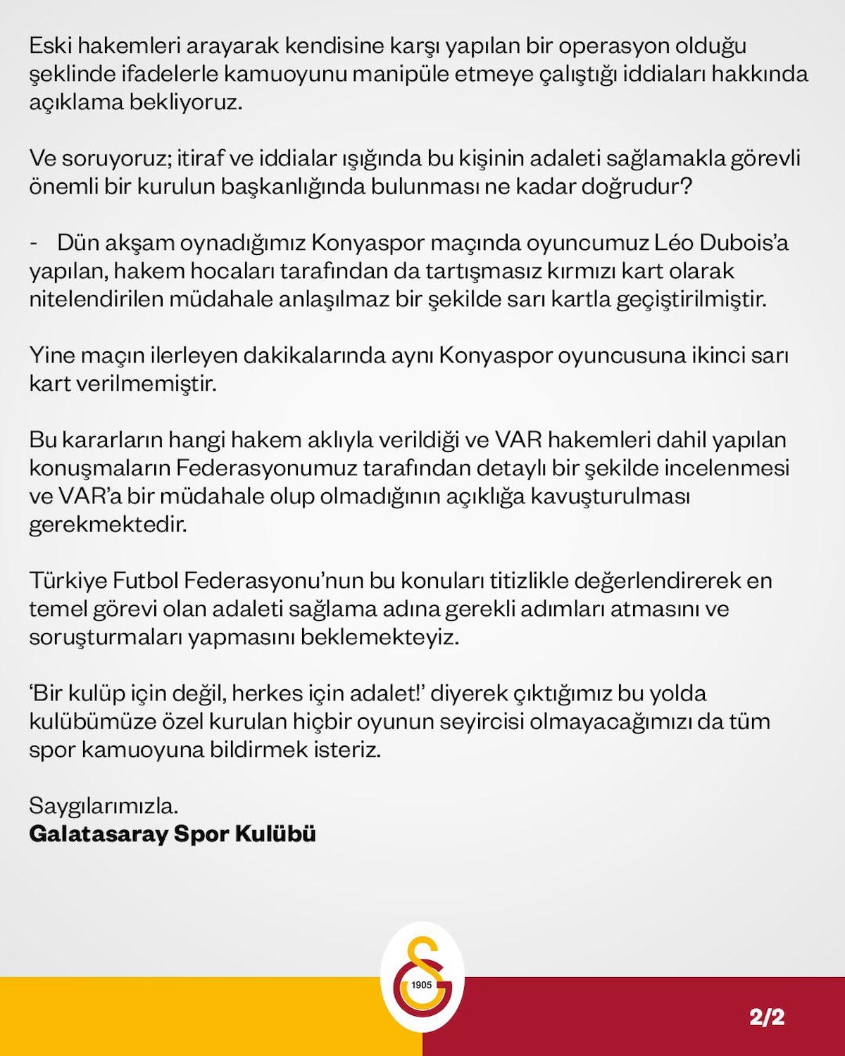 - Dün akşam oynadığımız Konyaspor maçında oyuncumuz Léo Dubois'a yapılan, hakem hocaları tarafından da tartışmasız kırmızı kart olarak nitelendirilen müdahale anlaşılmaz bir şekilde sarı kartla geçiştirilmiştir.