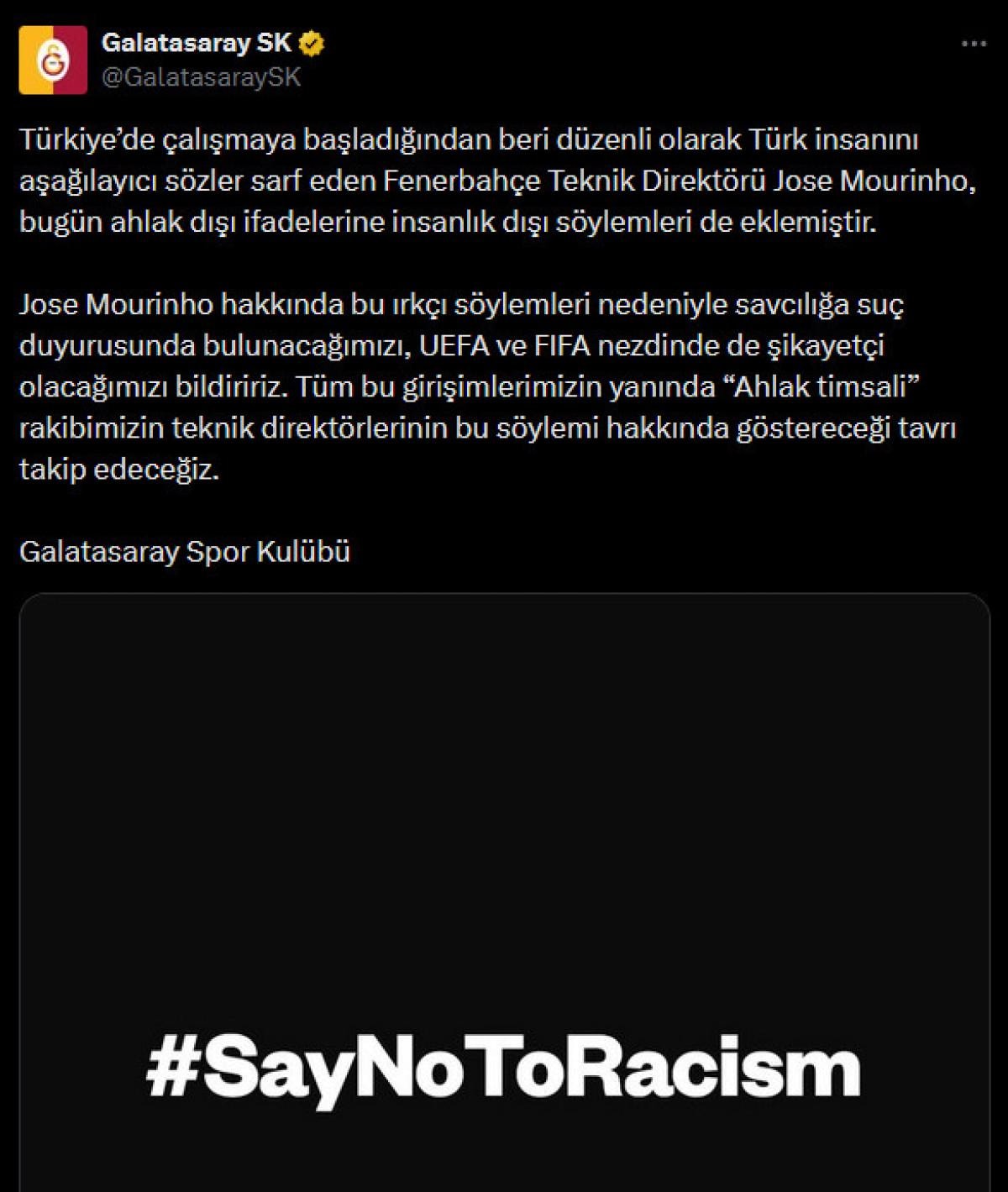 Jose Mourinho hakkında bu ırkçı söylemleri nedeniyle savcılığa suç duyurusunda bulunacağımızı, UEFA ve FIFA nezdinde de şikayetçi olacağımızı bildiririz. Tüm bu girişimlerimizin yanında “Ahlak timsali” rakibimizin teknik direktörlerinin bu söylemi hakkında göstereceği tavrı takip edeceğiz."