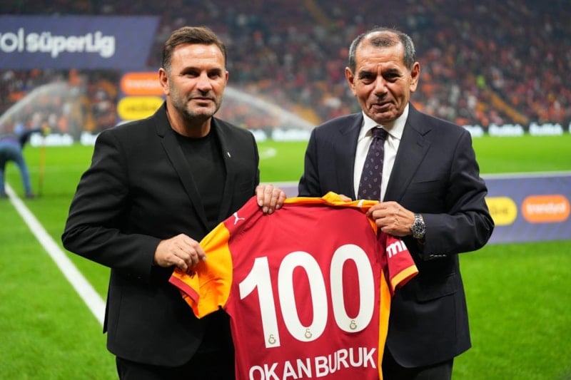 Galatasaray Başkanı Dursun Özbek, Galatasaray Teknik Direktörü Okan Buruk’a, sarı-kırmızılılarla 100. galibiyetine ulaşmasından dolayı plaket takdim etti.