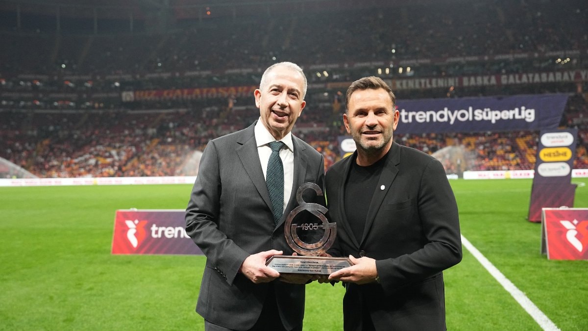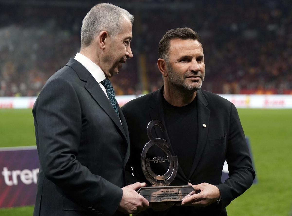 Galatasaray'ın başında Alanyaspor maçıyla Süper Lig'de 100. karşılaşmasına çıkan Teknik Direktör Okan Burak'a, Antalyaspor müsabaka öncesinde Galatasaray İkinci Başkan Metin Öztürk plaket takdim etti.