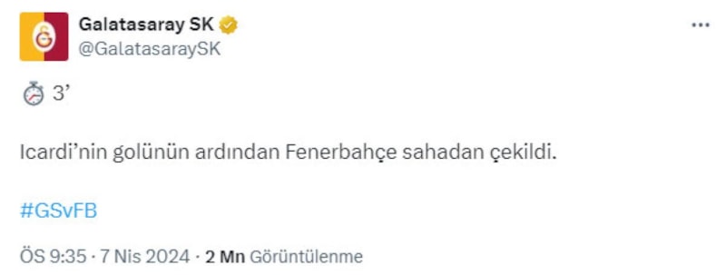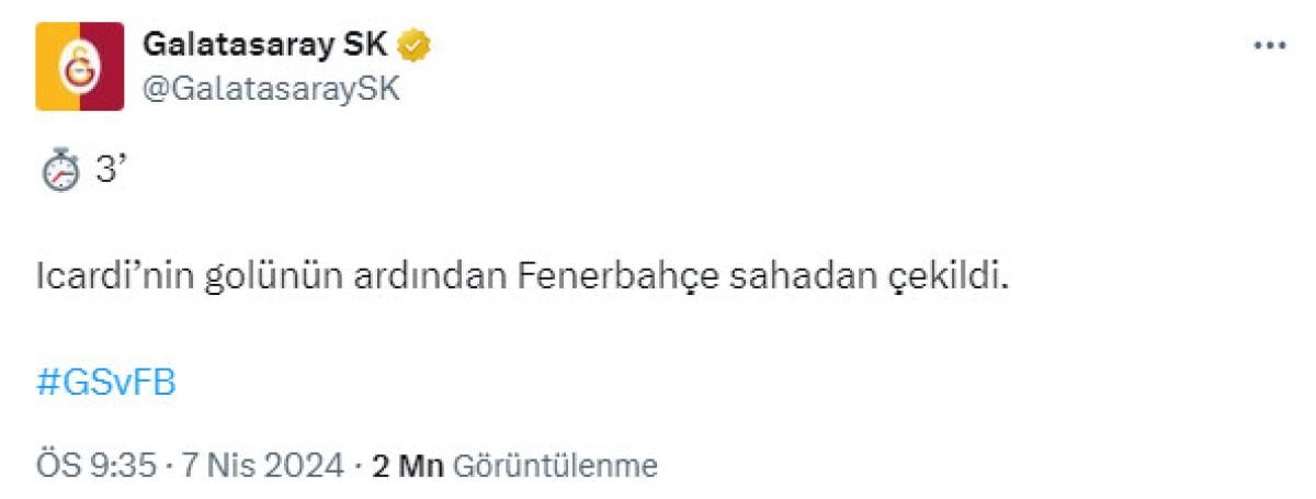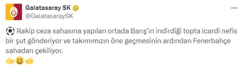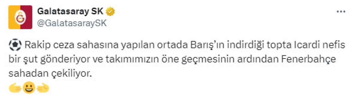 Galatasaray'ın paylaşımı: "Icardi nefis bir şut gönderiyor ve takımımızın öne geçmesinin ardından Fenerbahçe sahadan çekiliyor.