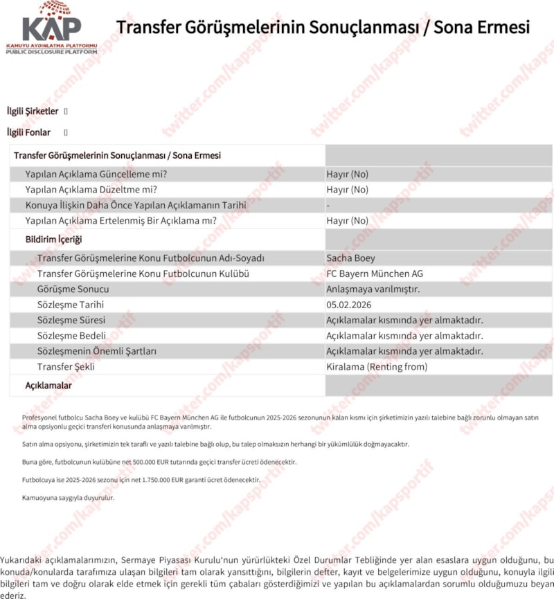 Sarı-kırmızılı takımdan transferle ilgili Kamuyu Aydınlatma Platformu'na (KAP) yapılan açıklamada, "Profesyonel futbolcu Sacha Boey ve kulübü FC Bayern München AG ile futbolcunun 2025-2026 sezonunun kalan kısmı için şirketimizin yazılı talebine bağlı zorunlu olmayan satın alma opsiyonlu geçici transferi konusunda anlaşmaya varılmıştır. Satın alma opsiyonu, şirketimizin tek taraflı ve yazılı talebine bağlı olup, bu talep olmaksızın herhangi bir yükümlülük doğmayacaktır. Buna göre, futbolcunun kulübüne net 500.000 Euro tutarında geçici transfer ücreti ödenecektir. Futbolcuya ise 2025-2026 sezonu için net 1.750.000 Euro garanti ücret ödenecektir" denildi.