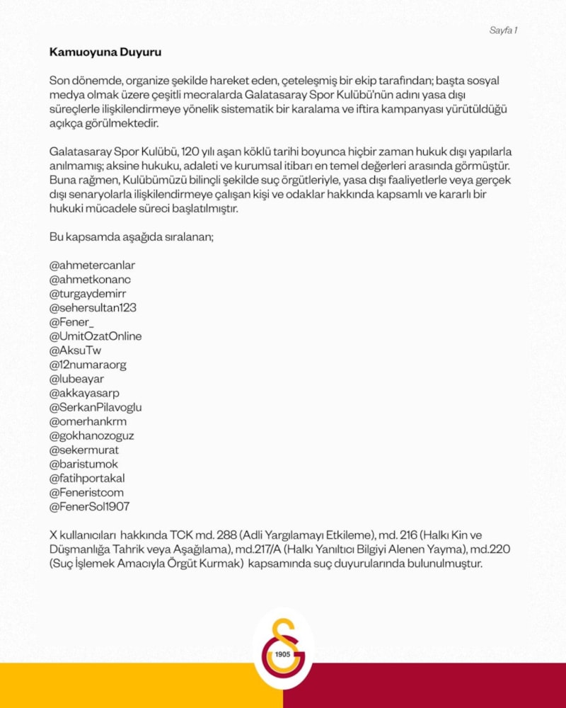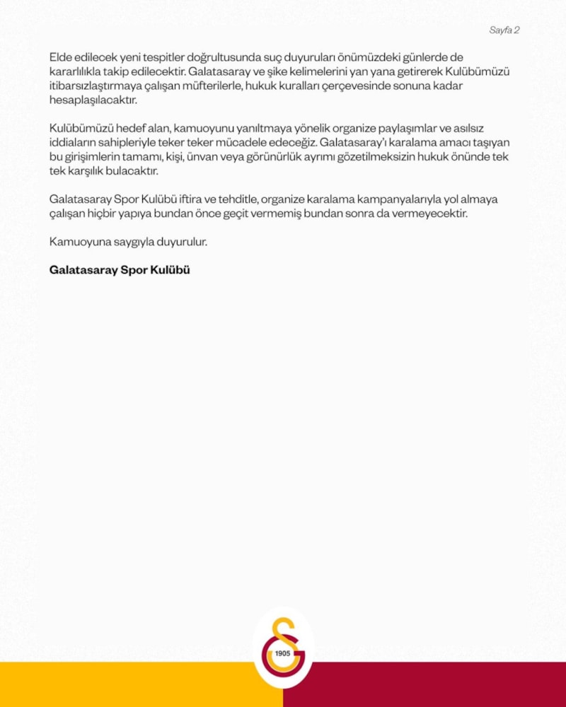 Son dönemde, organize şekilde hareket eden, çeteleşmiş bir ekip tarafından; başta sosyal medya olmak üzere çeşitli mecralarda Galatasaray Spor Kulübü'nün adını yasa dışı süreçlerle ilişkilendirmeye yönelik sistematik bir karalama ve iftira kampanyası yürütüldüğü açıkça görülmektedir.