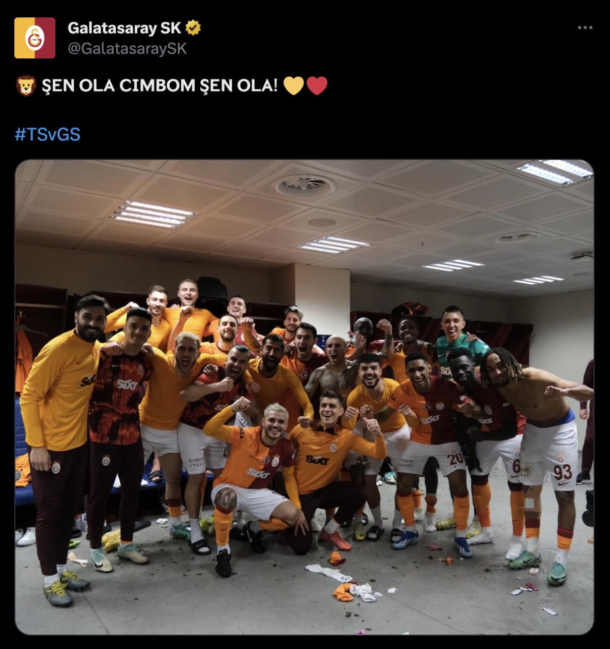 Sarı-kırmızılı takımın sosyal medya hesabından yapılan paylaşımda "Şen Ola Cimbom Şen Ola!" ifadeleri kullanılarak oyuncuların galibiyet pozu yer aldı.