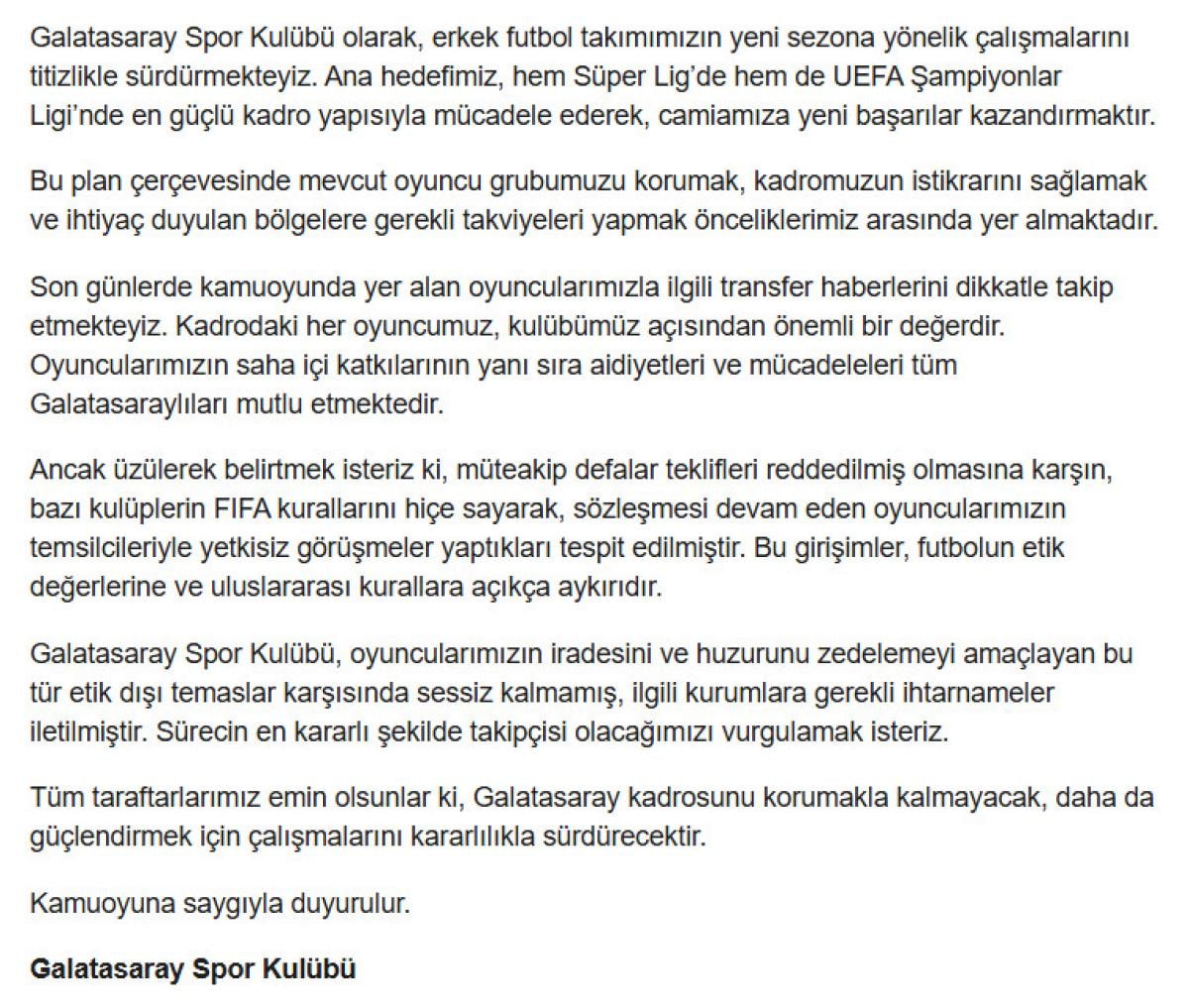 Son günlerde kamuoyunda yer alan oyuncularımızla ilgili transfer haberlerini dikkatle takip etmekteyiz. Kadrodaki her oyuncumuz, kulübümüz açısından önemli bir değerdir. Oyuncularımızın saha içi katkılarının yanı sıra aidiyetleri ve mücadeleleri tüm Galatasaraylıları mutlu etmektedir.
