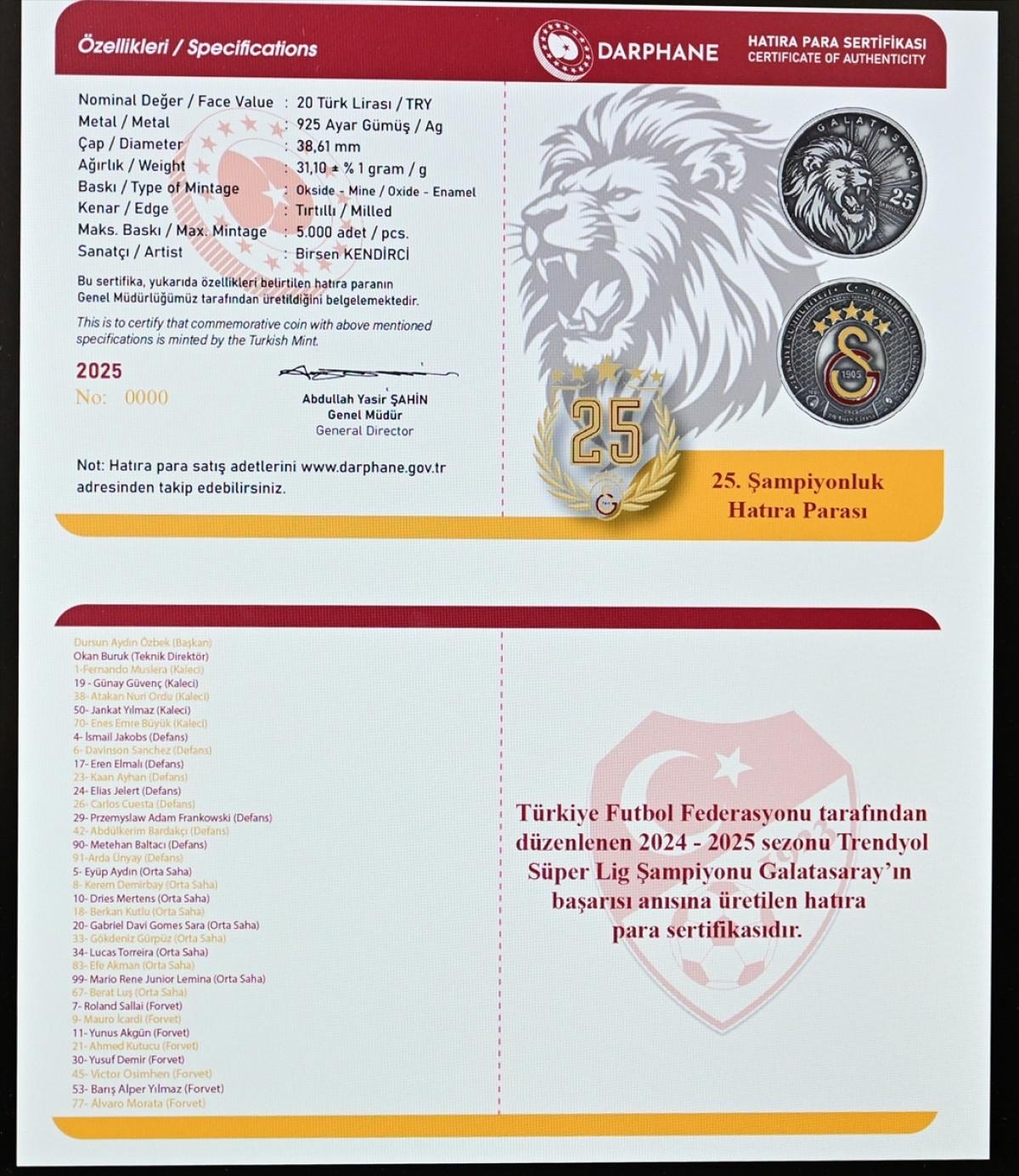 Her hatıra paramızda olduğu gibi bunda da bir sertifika olacak. Hatıra parayı satın alan kişilere sertifika verilecek. Üzerinde paranın görselleri, teknik özellikleri ile tüm futbolcuların isimleri yer alıyor. Burada sanatçı olarak adımın geçmesi benim adıma gurur verici.