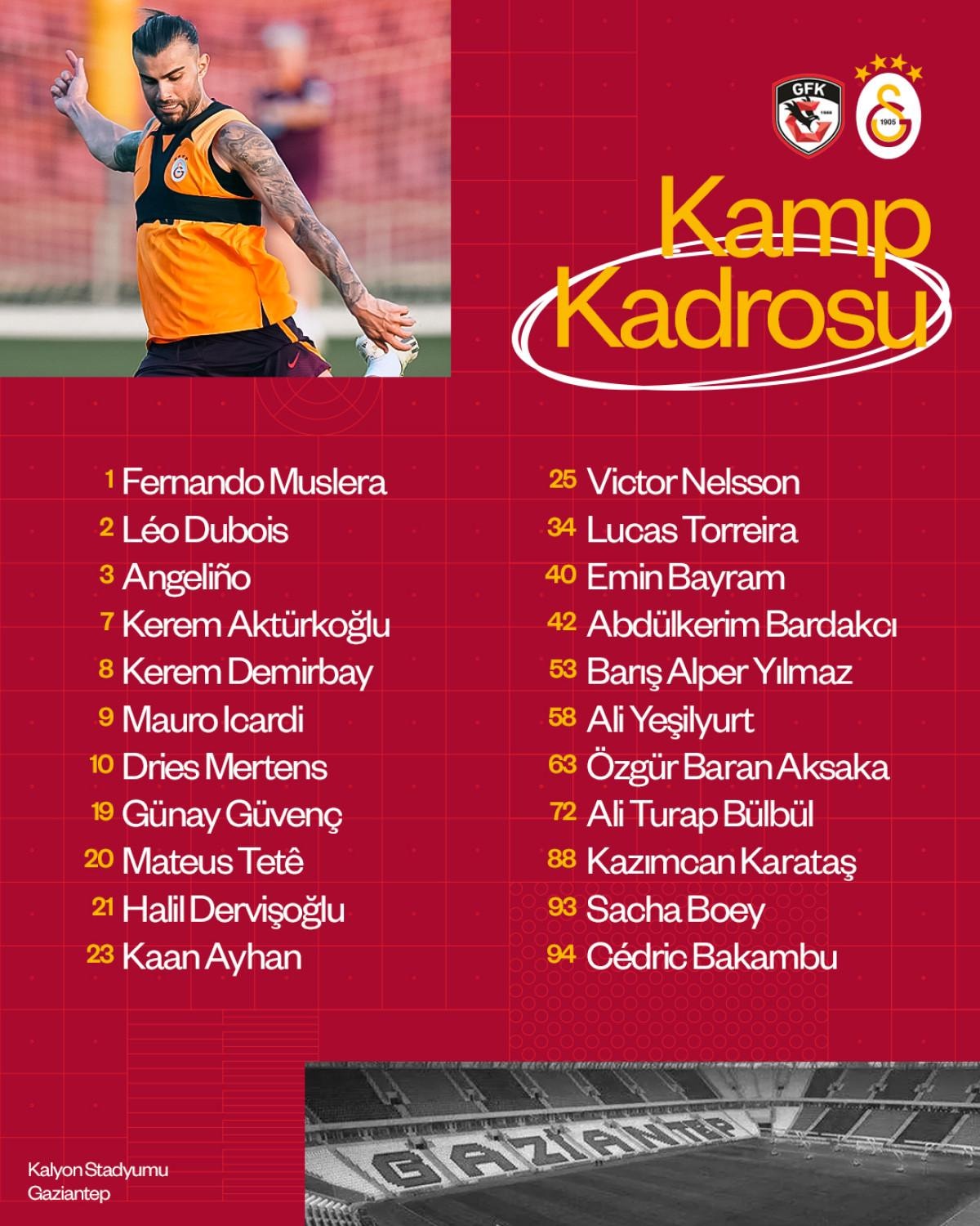 2 Eylül Cumartesi akşamı saat 21.45'te Kalyon Stadyumu'nda oynanacak maç öncesinde Okan Buruk yönetimindeki sarı-kırmızılıların kamp kadrosu belli oldu.