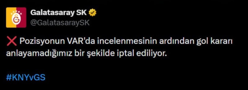 Galatasaray, sosyal medya hesaplarından pozisyon sonrası "Pozisyonun VAR'da incelenmesinin ardından gol kararı anlayamadığımız bir şekilde iptal ediliyor." paylaşımı yaptı.