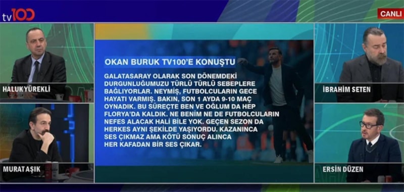 Galatasaray Teknik Direktörü Okan Buruk, TV100'ün ilgiyle izlenen Ersin Düzen ile Saha Dışı programına konuşarak takımı hakkındaki iddialara sert yanıt verdi.