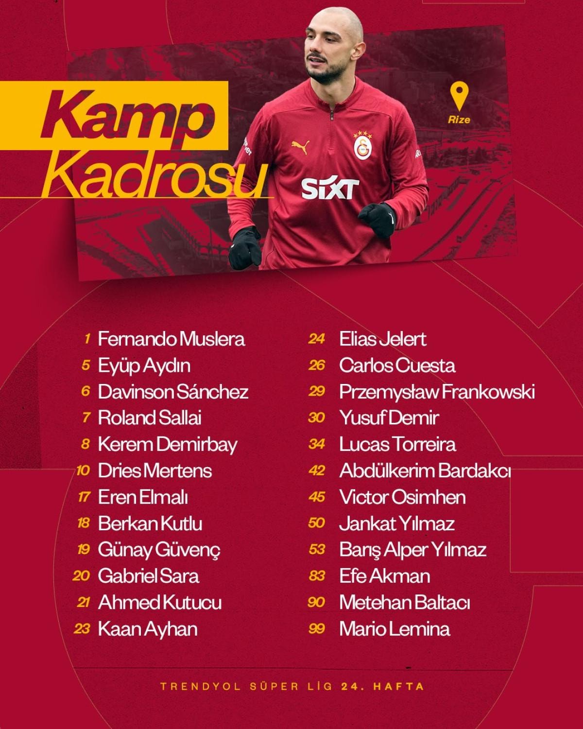 Fernando Muslera, Eyüp Aydın, Davinson Sanchez, Roland Sallai, Kerem Demirbay, Dries Mertens, Eren Elmalı, Berkan Kutlu, Günay Güvenç, Gabriel Sara, Ahmed Kutucu, Kaan Ayhan, Elias Jelert, Carlos Cuesta, Przemyslaw Frankowski, Yusuf Demir, Lucas Torreira, Abdülkerim Bardakcı, Victor Osimhen, Jankat Yılmaz, Barış Alper Yılmaz, Efe Akman, Metehan Baltacı, Mario Lemina