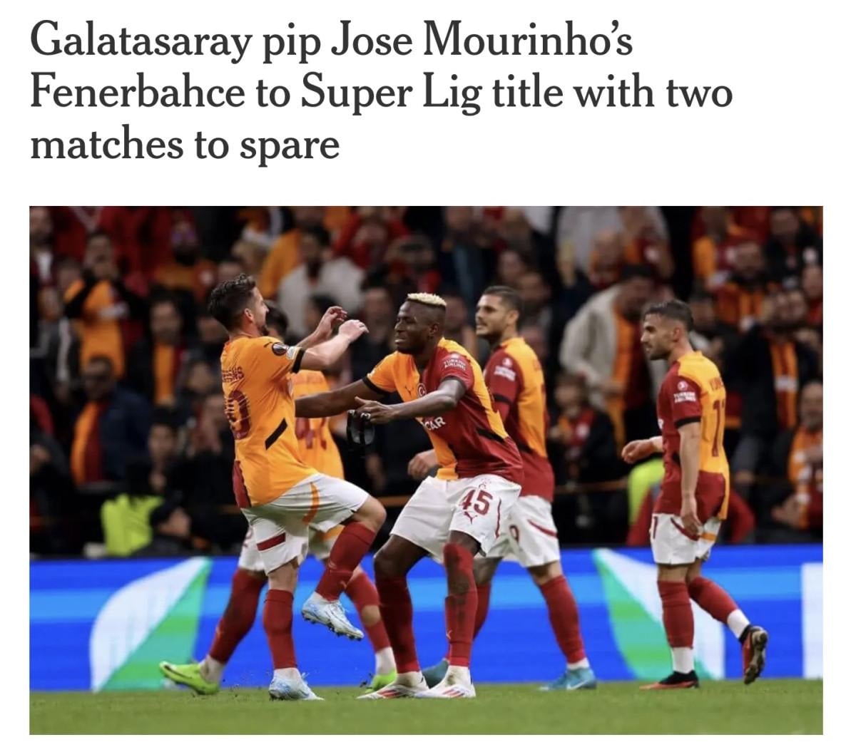 "Galatasaray Pazar günü üst üste üçüncü Süper Lig şampiyonluğunu elde ederek Jose Mourinho'nun Fenerbahçe'sini ikinci sıraya ve kupasız bir sezona mahkum etti."