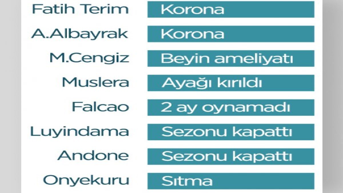 Cimbom'da sezonu kapatan Luyindama ile Andone'nin yanı sıra Fatih Terim, Abdurrahim Albayrak ve Mustafa Cengiz de sezon içinde sağlık sorunlarıyla boğuştu.