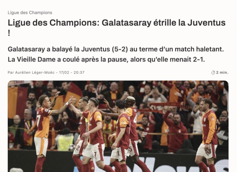 Şampiyonlar Ligi'nin play-off turunda Galatasaray, evinde Juventus'u ağırladı. Karşılaşmayı temsilcimiz 5-2 kazandı ve tarihi bir skora imza attı. Maçın yankıları Avrupa'da manşetleri süsledi.
