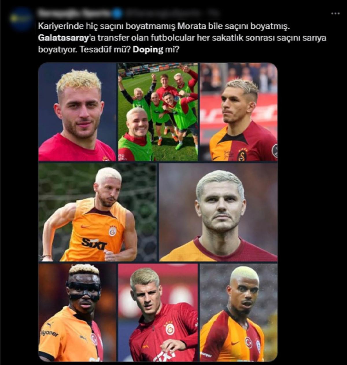 Galatasaraylı futbolcuların birçoğunun saçını sarıya boyatması üzerine sosyal medyada “Saç boyatmak, doping testlerinden geçmeyi sağlıyormuş” iddiası tartışma konusu oldu.